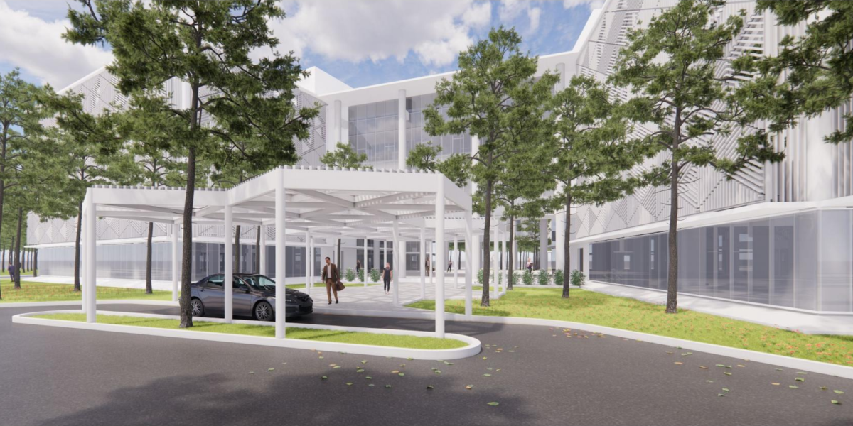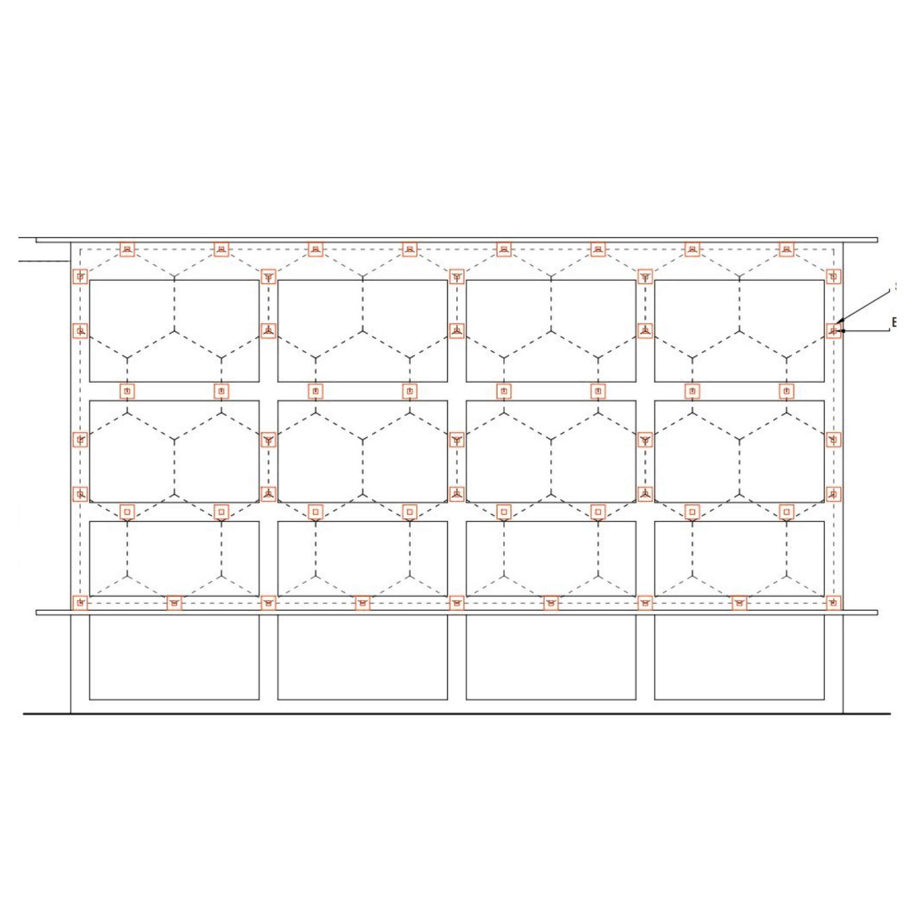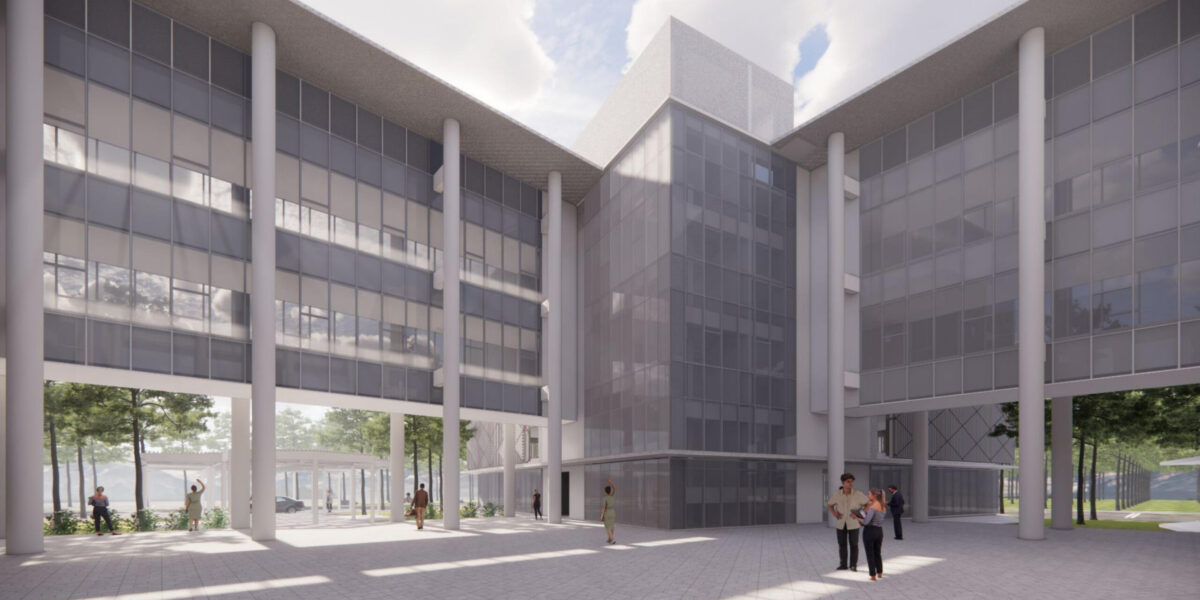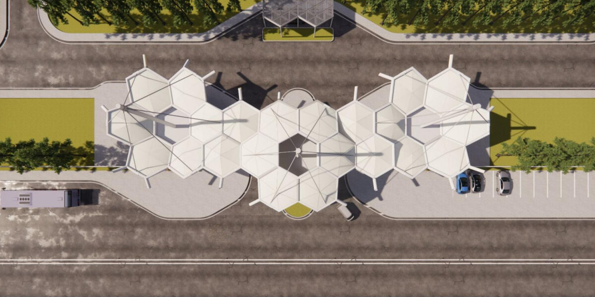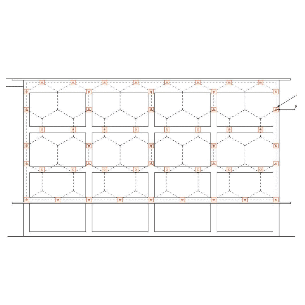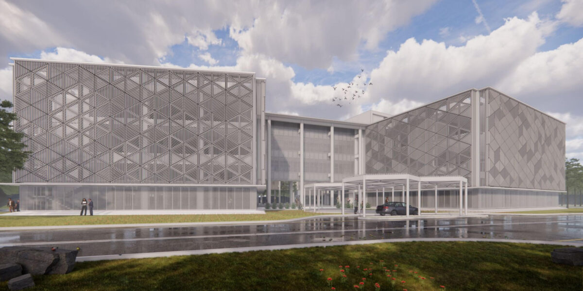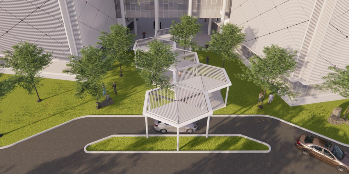 The building exteriors feature specially designed facades focused on reducing solar heat gain within the air-conditioned interior spaces. A consistent hexagonal grid pattern is incorporated into the facade design. This motif is not merely aesthetic but also serves as a visual representation of the client’s brand identity and core business principles. The repetition of the hexagon aims to reinforce their corporate ethos through the architectural language of the buildings.