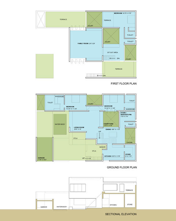 The idea was to create a look out space to appreciate the farms around. This was envisaged as a large volume perched on top of the main house that was shaded by the block above. The lower house had its own macro environment created using fenestrations and courtyards. The kitchen was in the front flanked by a verandah which would enable social interaction. Waterbodies and Trees were strategically located to humidify the dry air of the place.