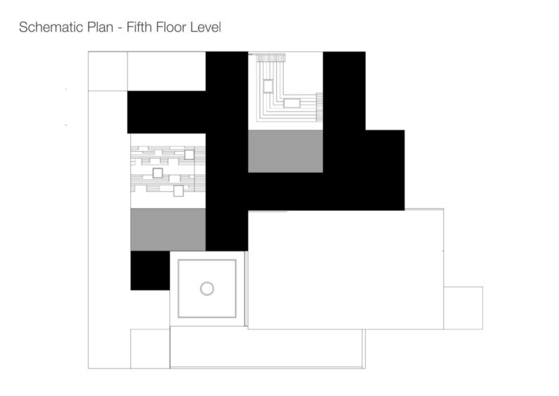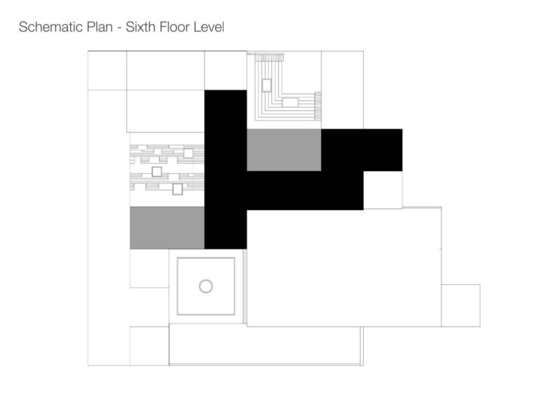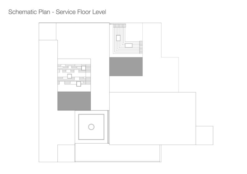 The Residential block is segregated with a service floor in between it and Institutional Block below. This floor has access to the open terraces over the Institutional block and the Auditorium.