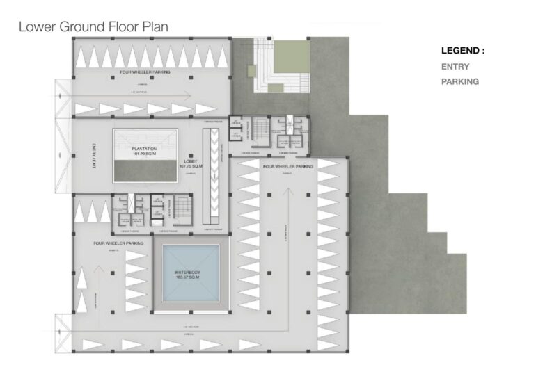 The part Stilted part Basement area underneath acts as a lobby for entering the premises. Access to podium is via steps and ramp here. Parking is also proposed in this area.