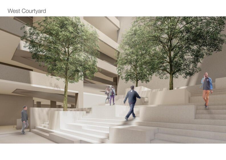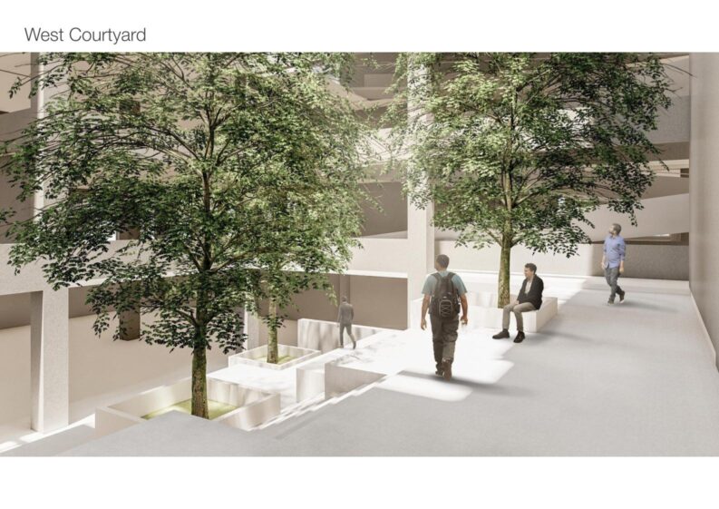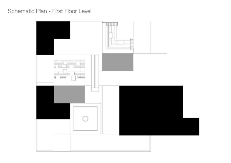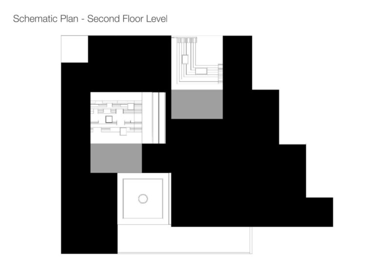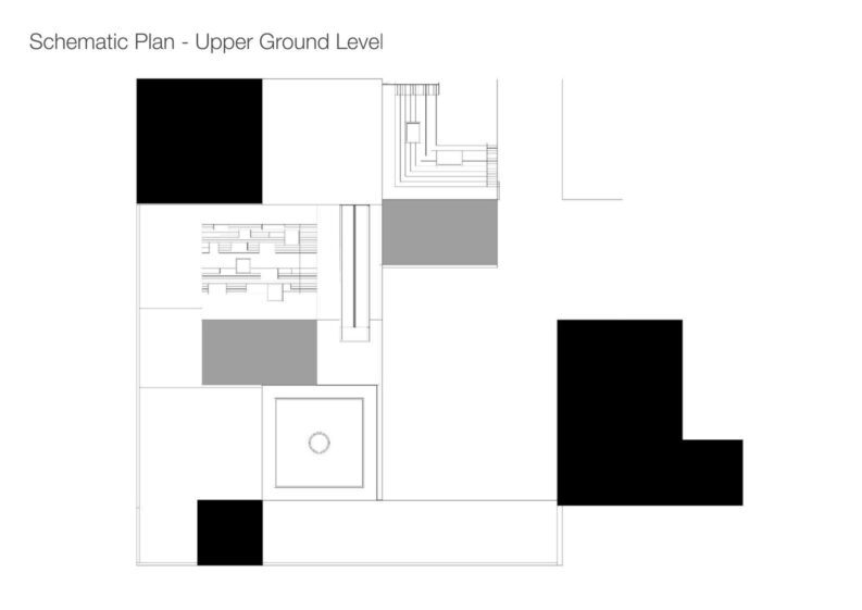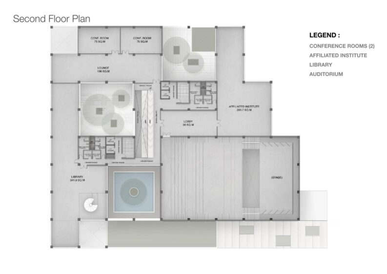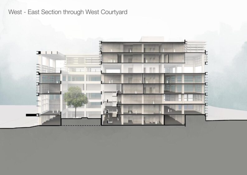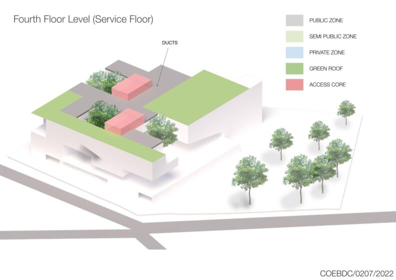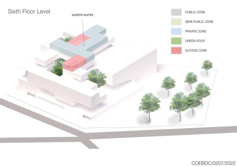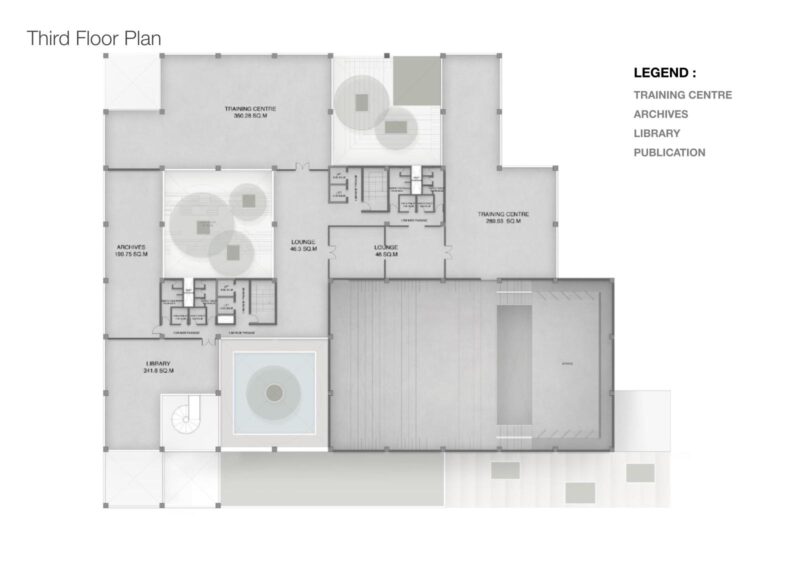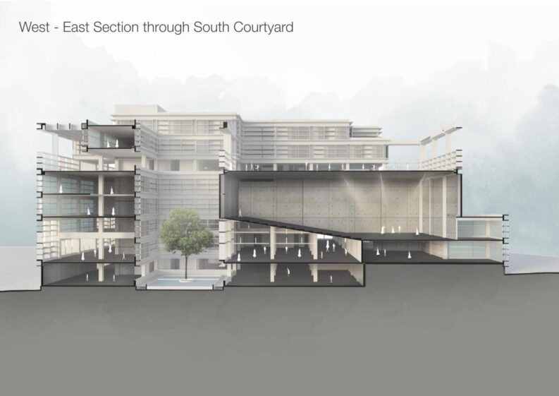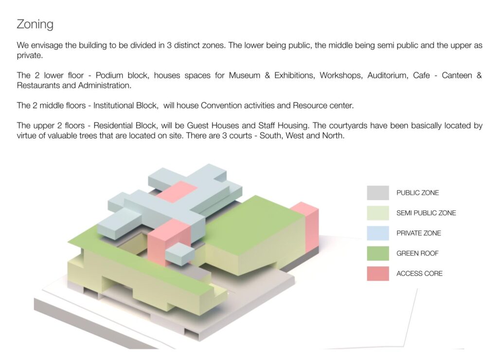 The upper 2 floors – Residential Block, will be Guest Houses and Staff Housing. The courtyards have been basically located by virtue of valuable trees that are located on site. There are 3 courts – South, West and North.