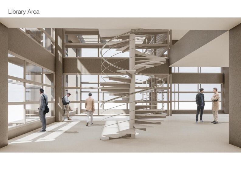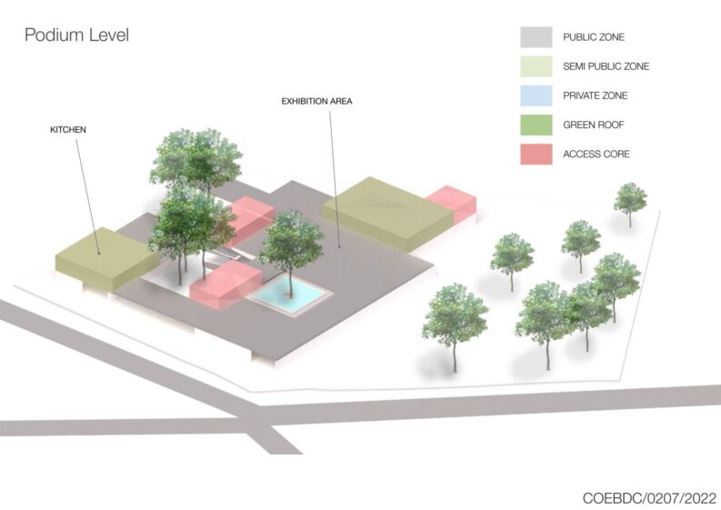 The Podium Block consists of public activities. Students of the adjoining Architecture and Civil Engineering colleges to all the other nearby can hang around in the courtyard, canteen / cafe. The space will welcome people from all walks of life to experience a free and creative environment. The space has been designed as a thoroughfare for people from all sides. This space will have permanent Museum and long term Architectural exhibition. A temporary Gallery space for events of allied fields of Architecture, Art & Design will keep the space lively with visitors.