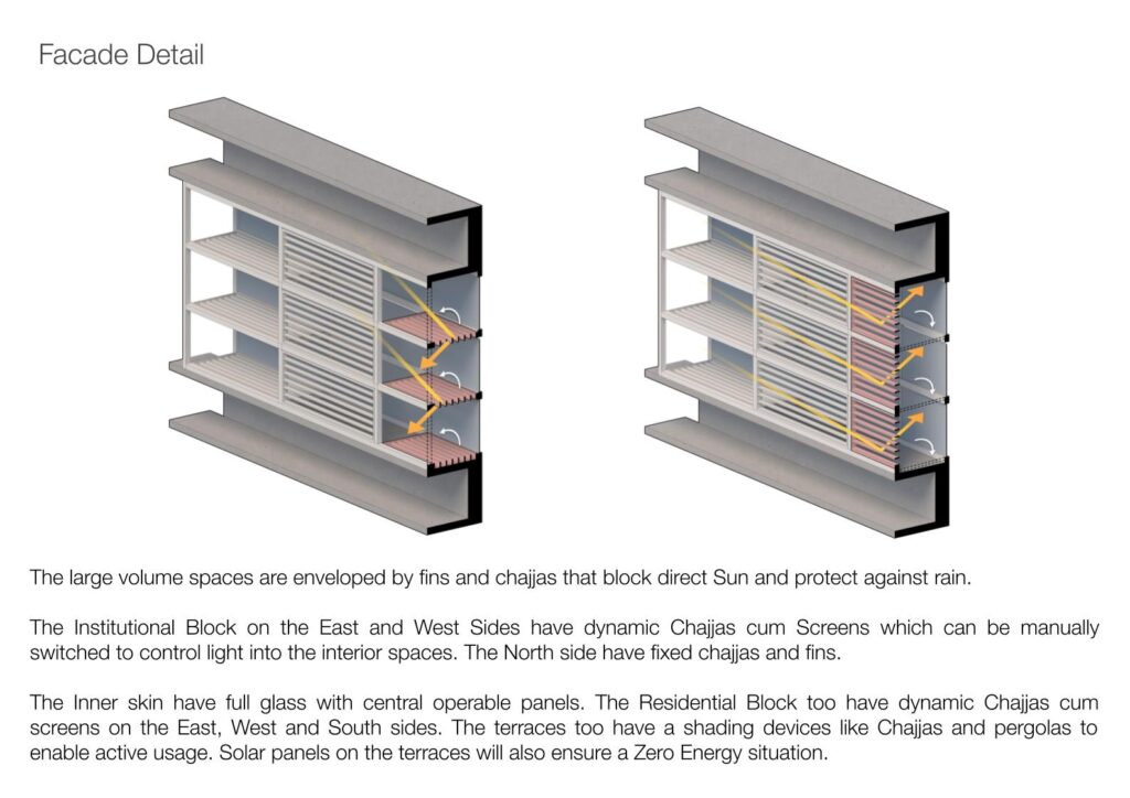 The Institutional Block consists of offices and Convention facilities. These are well connected with the Auditorium in the podium and open to sky spaces above.
